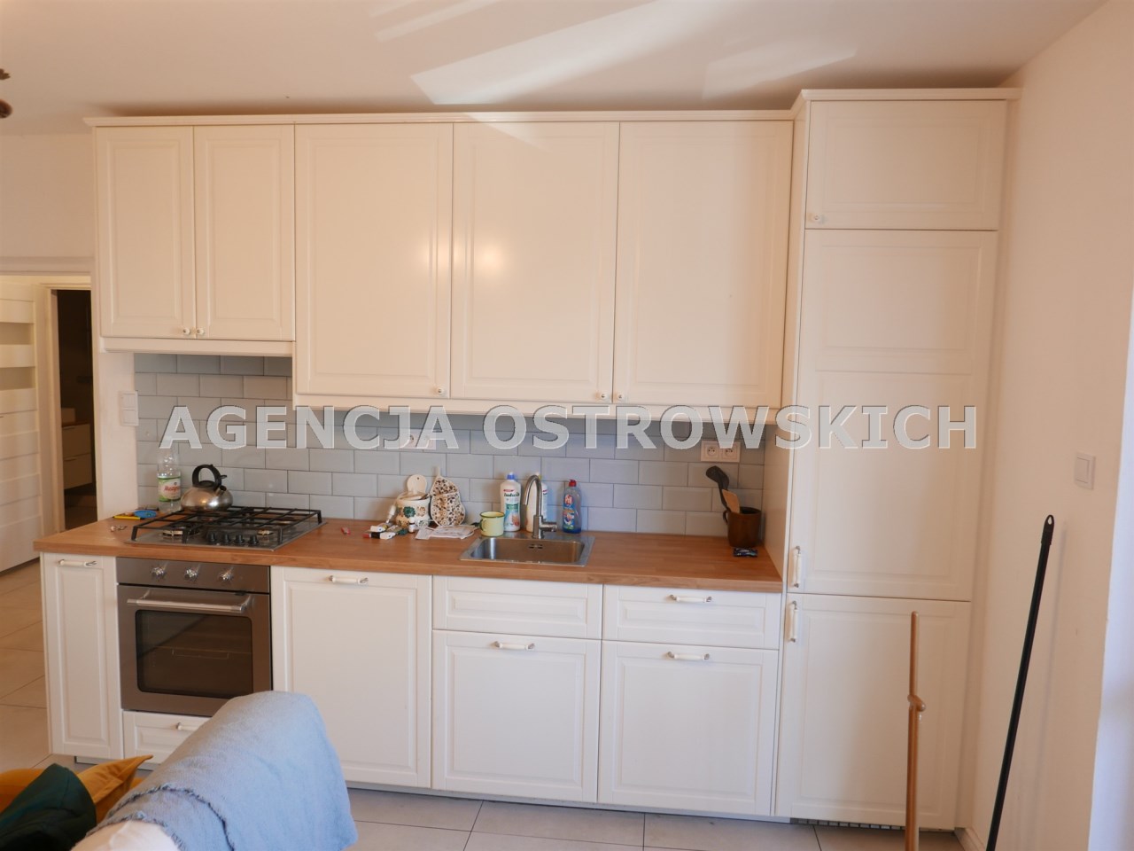 Salon o pow. ok.21 m2, z aneksem kuchennym zabudowanym szafkami, wyposażony w nowy sprzęt AGD : kuchnia gazowa, zlewozmywak, zmywarka ,lodówka), - klepka na podłodze .