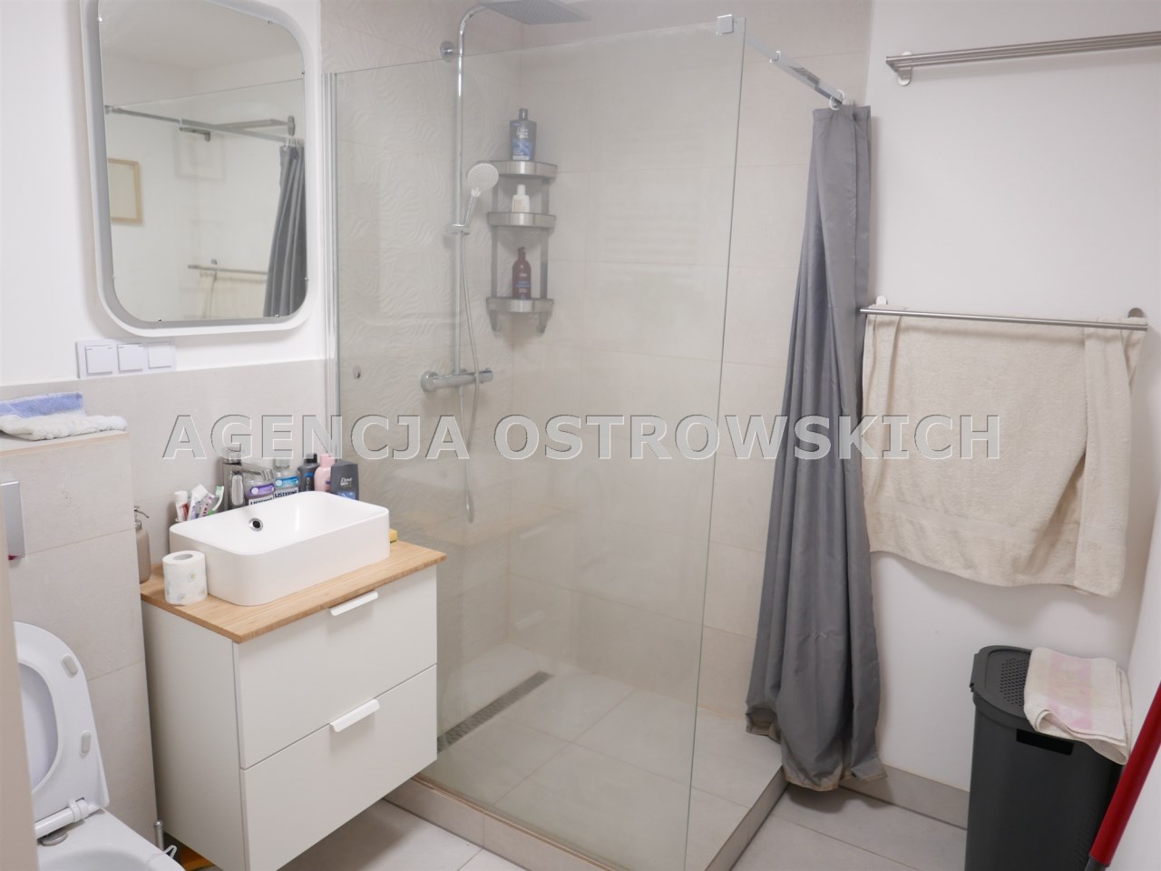 Łazienka razem z wc ok.5 m2 z kabiną prysznicową i deszczownicą- wykończona płytkami ceramicznym.