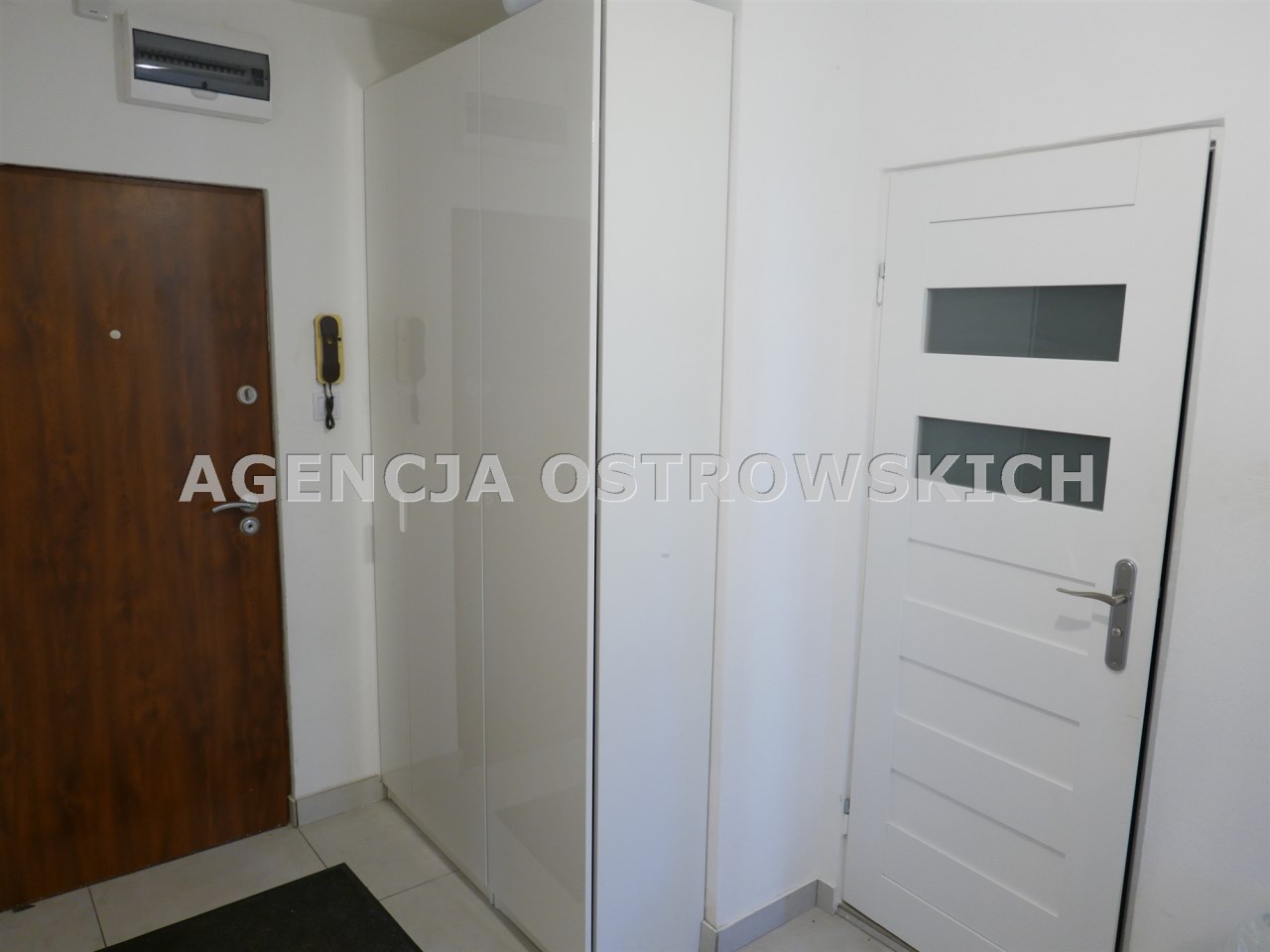 Korytarz ok.8 m2 z pojemną szafą odzieżową płytki ceramiczne na podłodze.